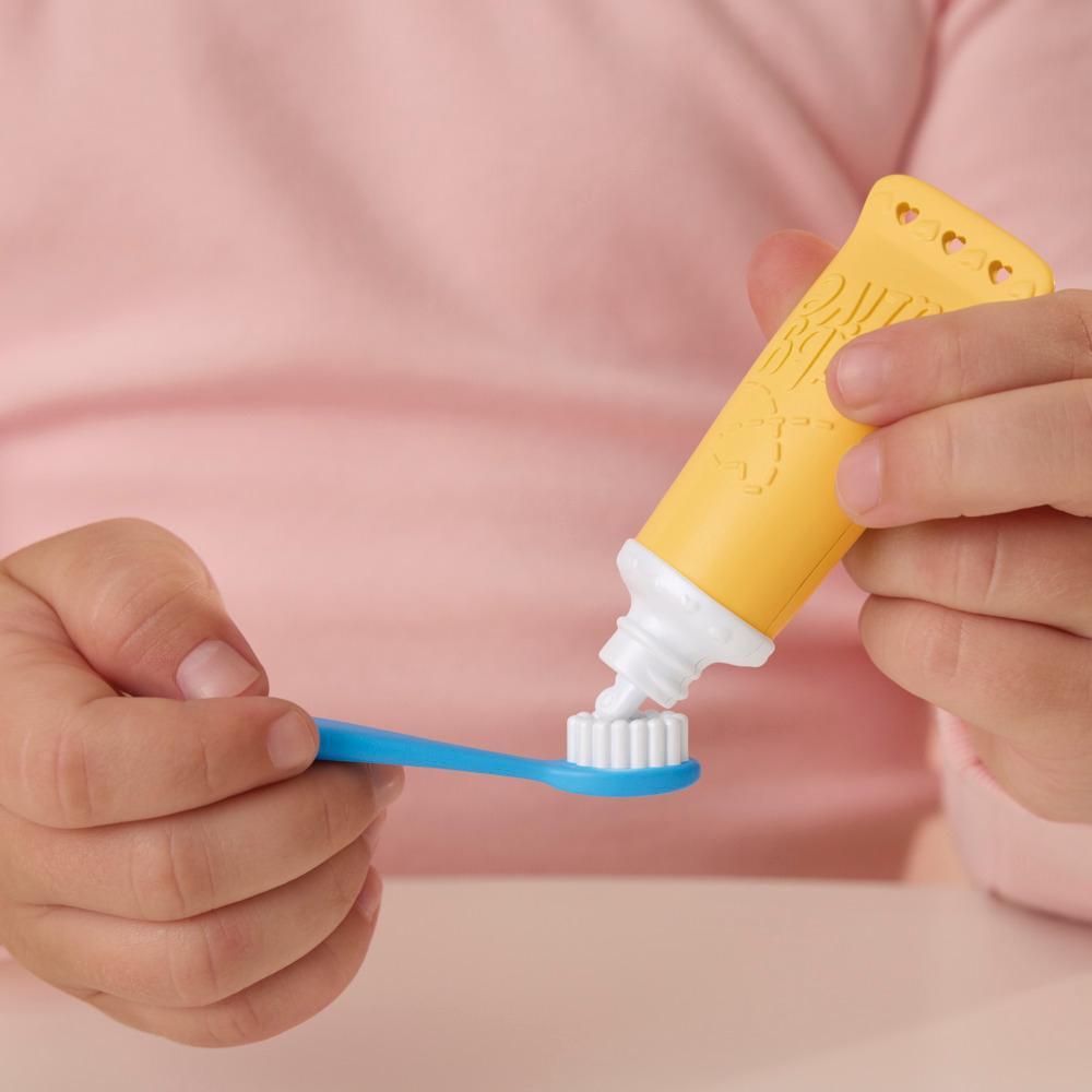 Goodnight, little Snoozer Bear! Play pretend sleepover anytime with this adorable 11 inch/28 centimeter baby doll set. Give Snoozer Bear his pacifier to shut his eyes and pull the pacifier away to open them again. The pacifier is attached to his adorably cozy pajamas to avoid losing it. Tell stories with his favorite bear-shaped finger puppet toy and then pretend brush his teeth with the toy toothbrush and make-believe toothpaste. When you’re looking for gifts for girls or boys or rewards for good behavior, they’re sure to love this baby doll playset. Baby Alive and all related properties are trademarks of .