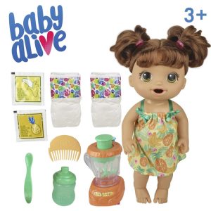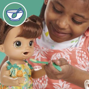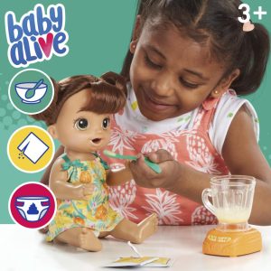 Whipping up a tropical treat for baby is so much FUN with Magical Mixer Baby doll’s real working blender! Just open 1 of the 2 included powdered doll food packets (additional powdered doll food sold separately), pour it in the blender with 3 tsp. (15 ml.) of water, and press down on the button to mix up baby’s food! This doll also comes with a spoon for feeding, and a comb for brushing her pretty brown hair. She drinks, wets, and “poops,” too! After baby’s finished her food, give her a few sips of water from her bottle. Uh-oh! It’s time to change baby’s diaper! It’s a great toy or gift for girls and boys ages 3 years old and up.