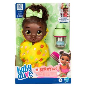 Berry Boo can’t wait for her first shampoo with the Shampoo Snuggle baby doll playset! Her shampoo bottle accessory has fun disappearing bubbles and features 3 ways to play: on its own, with water, or with your own kids shampoo. She has a tuft of brushable hair on top of her head and an adorable built-in bathing suit that makes her perfect for water play. Wrap her in her towel with fasteners for extra snuggle, then style her hair tuft with the comb and removable bow. With so much water fun on the way, this adorable companion makes a great baby doll toy for girls & boys 3 years and up. Baby Alive and all related properties are trademarks of .
