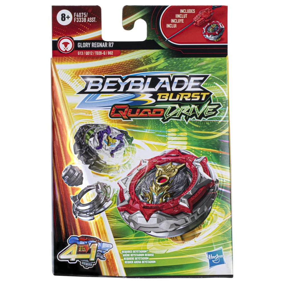Beyblade QuadDrive tech puts the future of Beyblade battling in your hands with the first ever 4-in-1 Beyblade top! Each QuadDrive top can be configured in 4 different ways, giving you 4 ways to strategize, 4 ways to customize, 4 modes to battle, and 4 modes to win! Size up your opponent and modify your QuadDrive top to gain the ultimate battle advantage. Train to become champion of the arena with the included right-spin Beyblade Burst QuadDrive Glory Regnar R7 G13 QD12 TD20-Q B02 top and launcher. Customize the top to Core and Apex mode for defense type or to Core+ and Apex+ mode for balance type. Harness the power of advanced QuadDrive tech in the QuadDrive Beystadium (Beystadium sold separately, subject to availability). Scan code on QuadDrive tops to unleash your top in a virtual battle in the Beyblade Burst app! Launch into head-to-head battles with Beyblade Burst Beystadiums, launchers, and spinning tops as you journey towards Beymastery! (Each sold separately, subject to availability.) and all related terms are trademarks of , Inc.