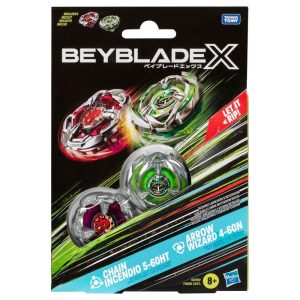 Experience the thrill of the next generation of Beyblade stadiums, launchers and tops: Beyblade X with the Beyblade X Chain Incendio 5-60HT and Arrow Wizard 4-60N Dual Pack Set which includes 2 right-spinning tops (Beystadium and launchers required, sold separately). Launch right into battle or reconfigure the interchangeable blade, ratchet, and bit of this Dual Pack with those of other Beyblade X tops (sold separately) to create your own unsurpassable Bey. Beyblade X features the X-Celerator Gear System innovation to level-up your game. When the gear of a Beyblade X top engages the rail of the Beystadium arena, it can super-accelerate into an Xtreme Dash rocketing it around the stadium for crushing collisions and epic bursts. Bladers launch their tops into fierce clashes against their opponent’s scoring points with each confrontation – first to score 4 points wins. Beyblade toys with authentic Takara Tomy die-cast metal tops make great kids gifts for boys and girls ages 8 and up.