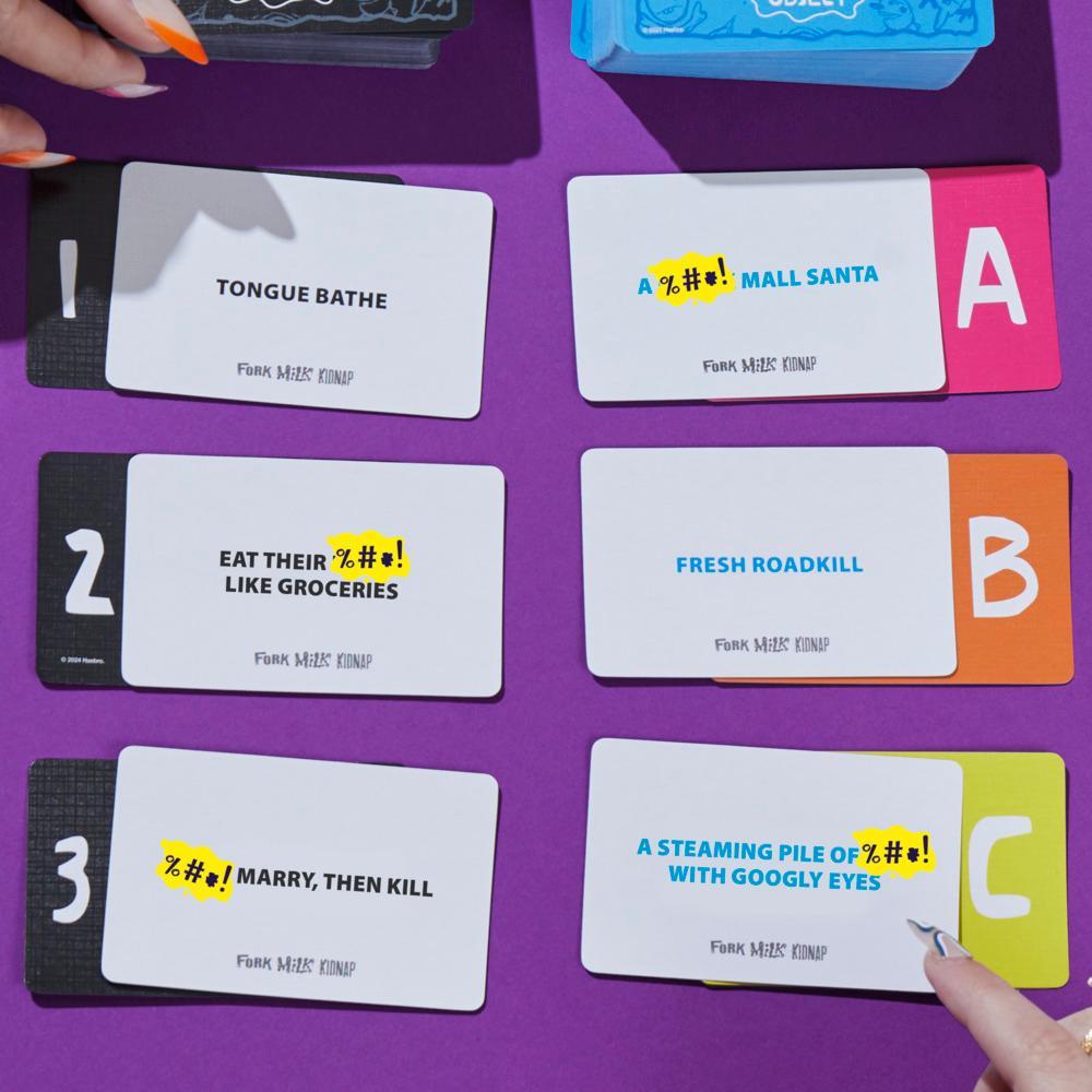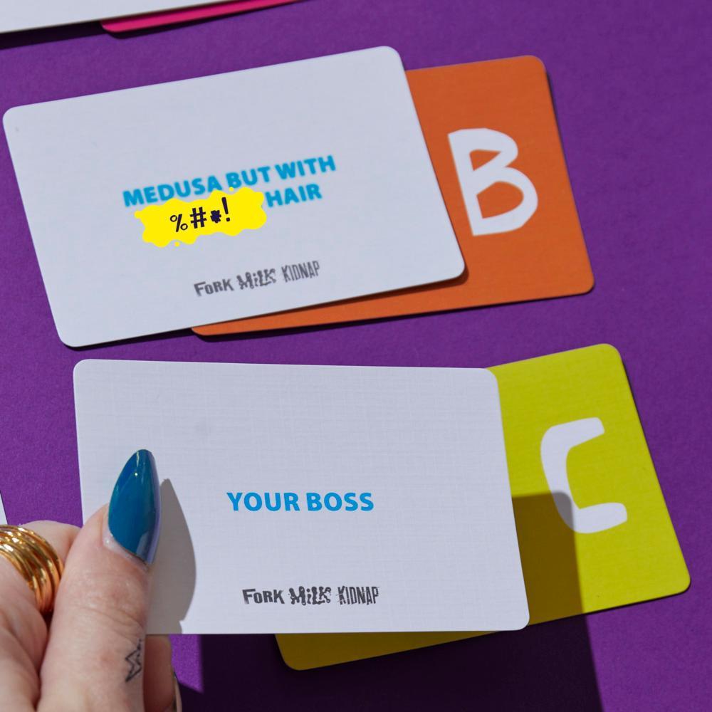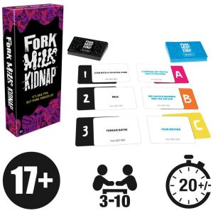 It’s like that game Fork Marry Kill, but your choices are more forked up. The Fork Milk Kidnap party game is the NSFW adults-only game that will have you and your friends making questionable choices. Each round, one player flips over 3 Action cards and 3 Object cards. Then everyone secretly decides which Object they would pair with each Action. For example, who would you tongue bathe? All 7 dwarfs, Florida Man, or the player of your choice? Everyone takes turns revealing all 3 of their pairings and explaining their reasoning. Expect some banter. And judgement. Players score a point when their pairings match the majority’s answers. The first to score 5 points wins! Looking for funny ice breaker games for adults or adult party games for game night? For ages 17 and up, the Fork Milk Kidnap game is a fun adult game for parties, girls nights in, and more. Fork Milk Kidnap, Gaming, and all related properties are trademarks of .