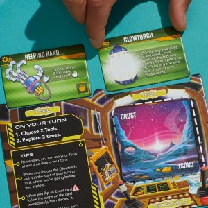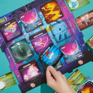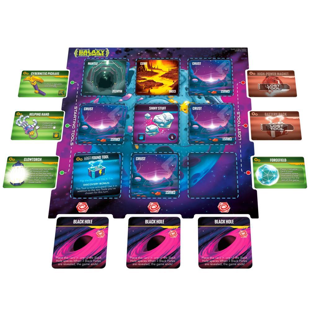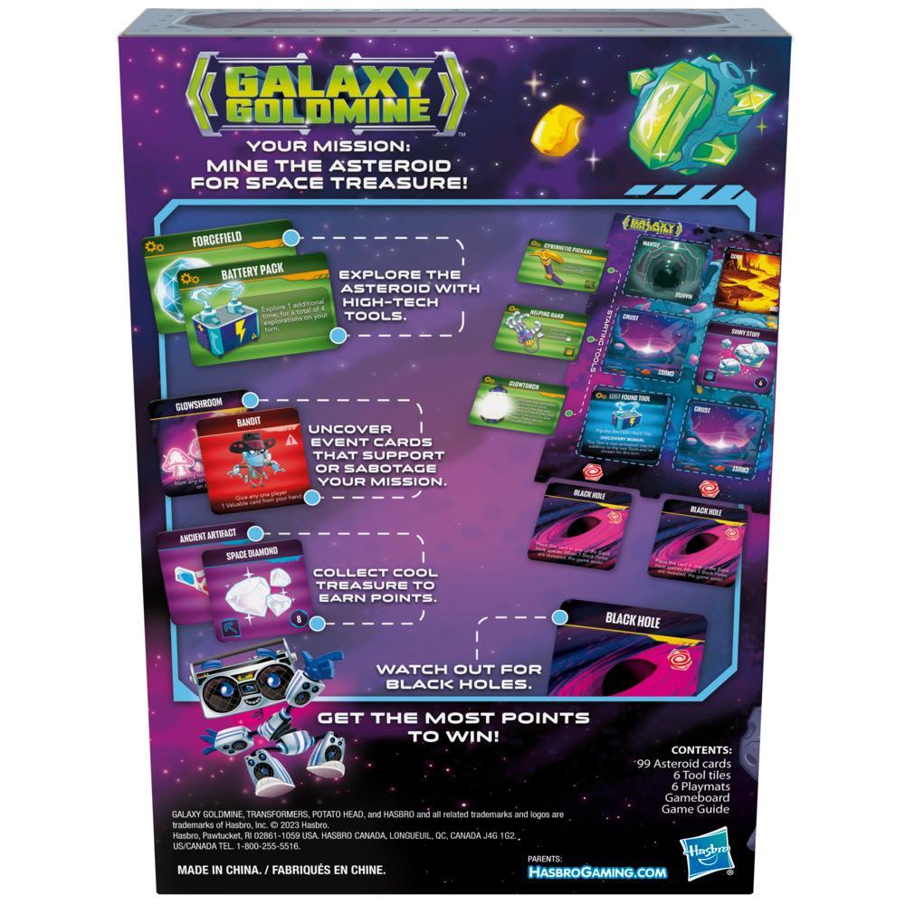 Your mission: mine the asteroid for awesome space treasure! This Galaxy Goldmine game is the out-of-this-world family card game that requires strategic thinking, memory, and a bit of luck. Players take turns exploring the asteroid’s 3 layers of cards, full of surprises waiting to be revealed. Players choose from their Tool cards, each featuring a high-tech gadget with a unique capability, to uncover and collect cool space treasure worth points. Players might even find a rare Holomap Fragment leading to the greatest treasure this side of the Milky Way. But watch out for Event cards with pitfalls, aliens, and bandits! When the table draws 3 Black Hole cards, the game ends and the player with the most points wins! Or collect all 3 Holomap Fragment cards to instantly win! Humorously illustrated, this light strategy card game delivers intergalactic fun. And with an eye-catching package and built-in storage, it makes a great travel card game for families or fun gift for kids ages 10+. Galaxy Goldmine, Transformers, Potato Head, and and all related terms are trademarks of .