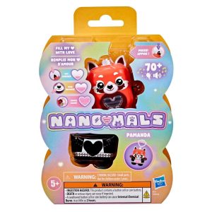 Unlock a world of fidgety, fashionable pocket-sized pets with Nano-mals Pamanda the red panda. Nano-mals are electronic fidget toys and adorable mini companions that need your love! Each Nano-mals character has a color-changing heart meter that kids can fill in so many fun and satisfying ways. When Pamanda’s heart meter drops, she’ll make sounds to let you know she needs care. If her heart meter is blue, she needs pets, so press her ears. If her heart is orange, she’s hungry — press her mouth to pretend feed her. Is her heart pink? Click her arms up and down to make her dance. What about purple? She wants to move! Flip, catch, or shake to fill her heart. Pamanda will celebrate her full heart with a song and colorful lights show. Give Pamanda some extra flair with a textured snap-on rocker outfit. Plus, she comes with an attached clip, so she makes a great kids keychain. Nano-mals are the perfect gift for kids who love animal toys, digital pets, and fidget toys. Nano-mals and and all related trademarks and logos are trademarks of , Inc.