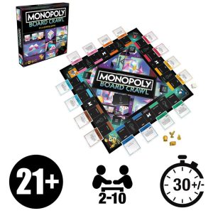 In the Monopoly Board Crawl game, you and your friends can enjoy a wild night out … in! It’s the official Monopoly drinking game. The object of the game is simple: drink (your beverage of choice) and collect the most properties to win. Roll the die and visit different spaces on the board—from Pregame to the Rooftop Bar. Sips are currency, so when you land on a property, you can buy it with a drink. Pay rent in sips, too—or steal that property from its owner by doing a dare. The player with the most deeds after everyone passes GO wins! This quick and fun adult party game is a hysterical game for game nights, and it makes one of the best game night games for groups. Funny adult party games are also great birthday, holiday, and white elephant gifts for ages 21+. (Alcohol consumption is not required to play this game.)The HASBRO and MONOPOLY names and logos, the distinctive design of the gameboard, the four corner squares, the MR. MONOPOLY name and character, as well as each of the distinctive elements of the board and playing pieces are trademarks of , Inc. for its property trading game and game equipment.