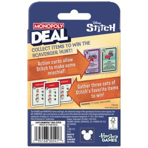 Stitch has set up a scavenger hunt across the island! In the Monopoly Deal: Disney Stitch Edition kids card game, compete to collect familiar items from Stitch’s world. Win the hunt by being the first to collect 3 different sets of them! Along the way, call on the mischievous alien with action cards that let you collect money or snatch and swap items. This family card game for kids and adults can be played in about 15 minutes, so it’s a great game for game nights and impromptu fun. Monopoly card games for kids and adults also make ideal travel games. Plus, Disney Stitch toys and family games are wonderful holiday and birthday gifts for girls, boys, and kids ages 8+.Copyright Disney.The and Monopoly names and logos, the distinctive design of the gameboard, the four corner squares, the Mr. Monopoly name and character, as well as each of the distinctive elements of the board and playing pieces are trademarks of , Inc. for its property trading game and game equipment.