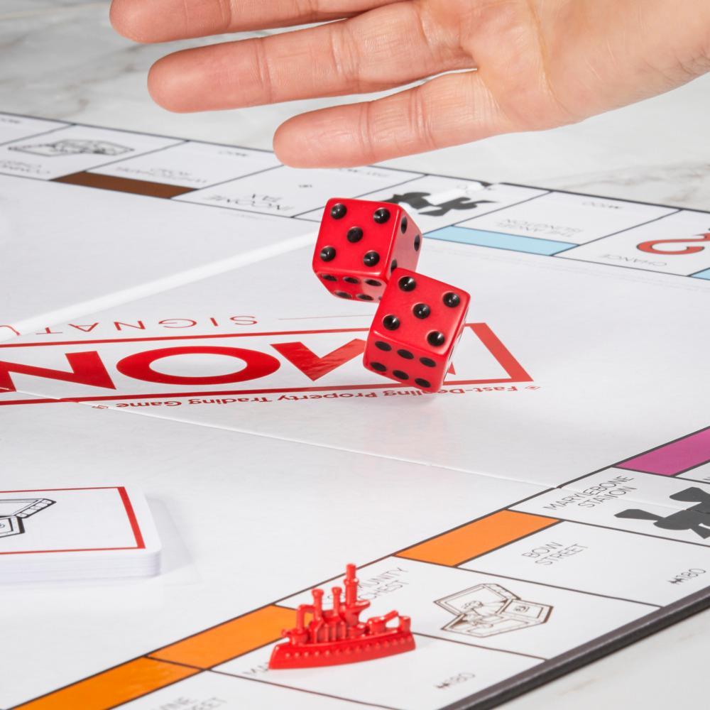 Chase your fortune with this ready-to-display Monopoly Signature Collection board game! Roll the red dice to purchase properties, and raise rent with luxe Houses and Hotels. Players can arrange the foil-treated money in their own personal tray and move around the board with one of 8 red enamel Monopoly tokens. Chance and Community Chest cards may lead players down the path to bankruptcy so don’t get too comfortable! Accumulate wealth, test friendships, and create lifelong memories for generations to come. With classic Monopoly gameplay in a premium package, this collector’s edition of the Monopoly game makes a perfect gift for Monopoly fans ages 8 and up. The Gaming and Monopoly names and logos, the distinctive design of the gameboard, the four corner squares, the Mr. Monopoly name and character, as well as each of the distinctive elements of the board and playing pieces are trademarks of .