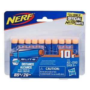 Blast with Official Nerf Darts — the darts that hit the mark for performance and quality! Stock up on this refill pack of 10 Nerf Elite darts and be ready to reload when Nerf competitions heat up. Nerf Elite darts are designed for distance and blast up to 85 feet (26 meters).* They are compatible with all Nerf toy blasters that use Elite darts, so players can use also them with Elite, AccuStrike Elite, Zombie Strike, and Modulus blasters. Nerf darts are constructed of foam with flexible, hollow tips, making them fun to blast indoors and outdoors. Load Nerf blasters with tested and approved Official Nerf Darts, the darts that deliver performance and quality with every blast! Blasters each sold separately. *Distance varies according to blaster. Nerf and all related properties are trademarks of .