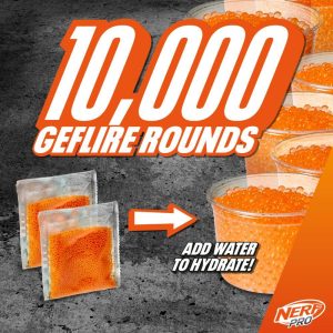Burst into battle with Nerf Pro Gelfire blasters featuring hydrated rounds that burst on impact! These massive-capacity blasters deliver high-performance blasting to ignite your competitive advantage. Nerf Pro Gelfire rounds come dehydrated in the box, giving you a huge amount of rounds for multiple refills. Add water to hydrate the rounds to prepare them for use. The hydrated rounds fire from the blaster at a high velocity and burst when they hit a target. No need to pick up rounds! The Nerf Pro Gelfire Raid blaster features scattershot blasting, unleashing 5 rounds with each trigger pull. The blaster includes an 800-round capacity hopper and 10,000 dehydrated Nerf Pro Gelfire soft super absorbent polymer projectiles. Includes trigger lock to prevent accidental firing and protective eyewear. Up to 150 FPS. Outdoor use recommended. For ages 14 and up. Nerf and all related properties are trademarks of .