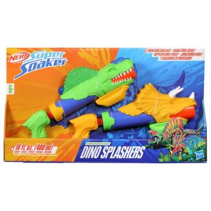 Team up with legendary dinosaurs as a member of the elite DinoSquad! Harness the extraordinary force of the greatest dinosaurs of all and blast into amazing adventures! The Nerf Super Soaker Dino Splashers set includes 2 water blasters with colorful dinosaur designs. Each blaster features a different dinosaur! One blaster captures the look of a Triceratops dino, and the other blaster has a Spinosaurus design. Choose your dino and unleash a deluge of water in outdoor games! Each blaster’s tank has a capacity of up to 8 fluid ounces (240 ml) of water. The plunger makes it easy to fill and fire: Submerge the front of the blaster in water, pull back the plunger handle to fill the tank, and push the handle forward to shower targets with a stream of water. The Nerf Super Soaker brand has been pouring on the fun since 1989 and continues to drench everyone with water-blasting mayhem! Head outdoors for extreme soakage with Nerf Super Soaker blaster outdoor toys! Nerf and all related properties are trademarks of .