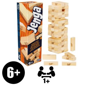 In this Jenga game, enjoy classic Jenga gameplay or add more ways to play using the FREE Jenga web app! Pull a block from the stack, then try to add it to the top without toppling the tower. The more Jenga blocks get pulled, the more unsteady the tower becomes, until … CRASH! Keep the game fresh by adding the web app to a phone or tablet, and “roll” its virtual die for extra edge-of-your-seat challenges! Race the clock, stack 2 blocks, pick an opponent to take your turn, use thumbs only, team up, or place the block anywhere but the top row. This wooden block balancing game is a great choice for those looking for family games, game night games for groups, or kids birthday party games. Family party games make fun holiday and birthday gifts for kids ages 6+ and adults. (Parents: Scan the in-pack QR code or access the web to play with the digital die on a phone or tablet. No downloading or additional purchase needed. Device not included.)Jenga is a registered trademark of Pokonobe Associates. Copyright Pokonobe Associates. Used under license from Pokonobe Associates. All rights reserved. and all related trademarks and logos are trademarks of , Inc. Copyright .