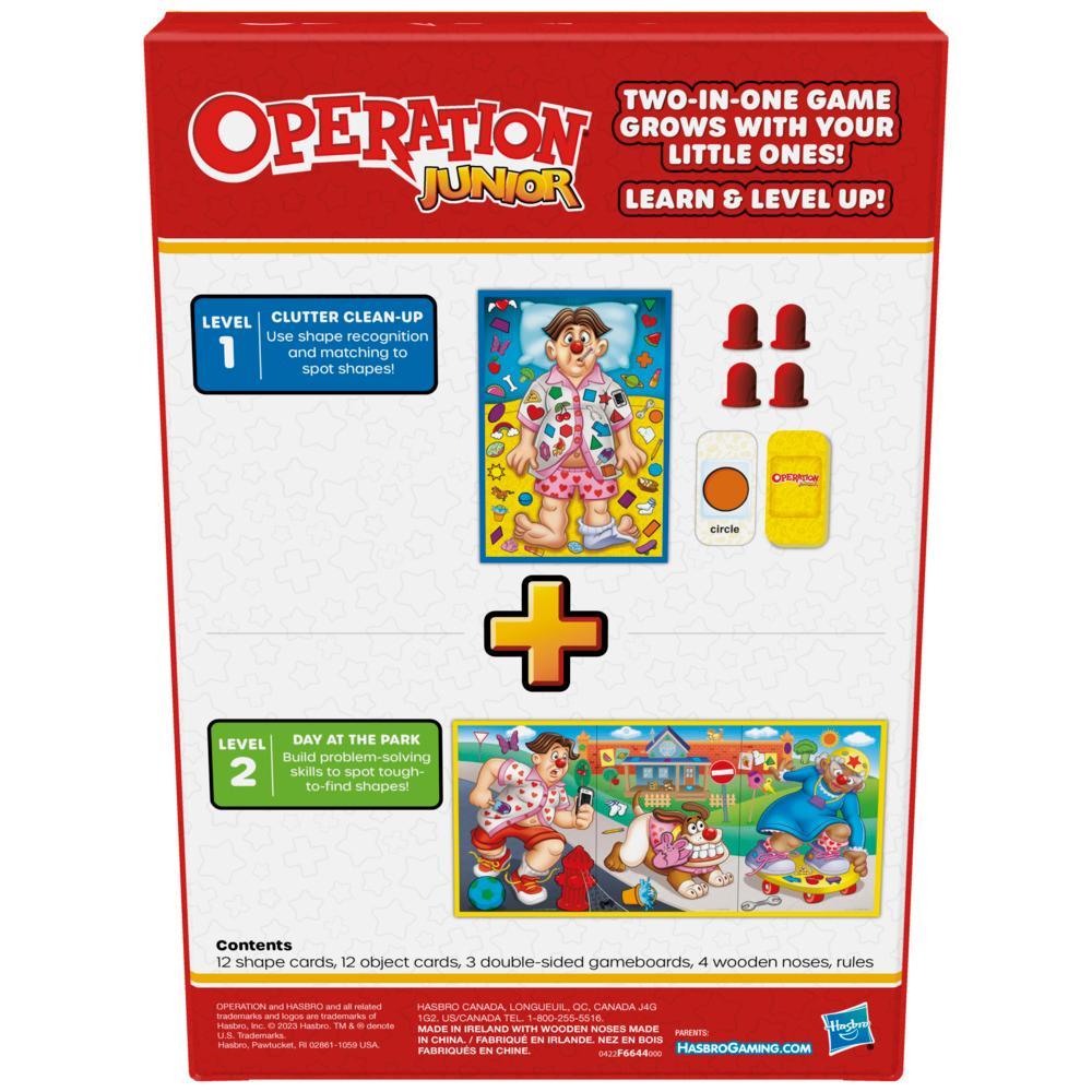 Enjoy 2 games in 1!This Operation Junior board game is the shape-finding adventure that grows with your little one. Players take turns flipping over shape and object cards. In the Level 1 Clutter Clean-Up game, they race to find them in 1 of the 3 gameboards (your choice!). For the advanced Level 2 A Day in the Park game, flip the boards over and connect them to create a silly, slapstick scene full of objects that are harder to find. In either game, the first player to place Cavity Sam’s nose on the shape or object that matches the one on the card collects that card. The player with the most cards in the end wins! Boxed in plastic-free packaging, this game includes 4 FSC-certified wooden noses, plus 12 shape cards, 12 object cards, and 3 double-sided gameboards, all made of FSC-certified paper goods. It’s a fun kids game for playdates, the classroom, and family game night. Operation and and all related terms are trademarks of .