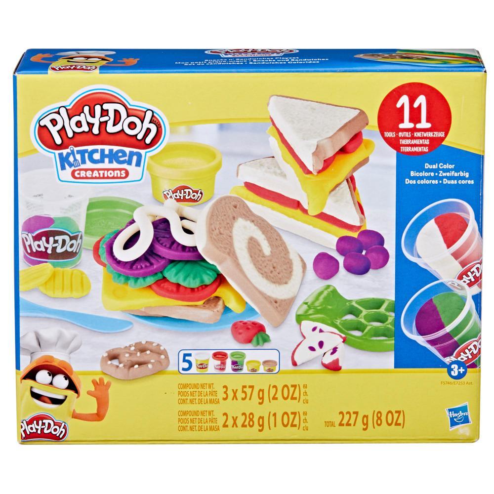 The Play-Doh Snacks ‘n Sandwiches Playset turns playtime into pretend lunchtime! This Play-Doh set for kids 3 and up has everything they need to create a variety of make-believe treats. Combine imaginary bread, make-believe meat, cheese, and veggies into silly sandwiches, then pair them with pretend pretzels and fake fruits. You can even add some silly sides like make-believe strawberries and salads, or use the slicer to make Play-Doh apple wedges! With 5 cans of modeling compound, kids can have pretend picnics again and again! , Play-Doh, and all related properties are trademarks of .