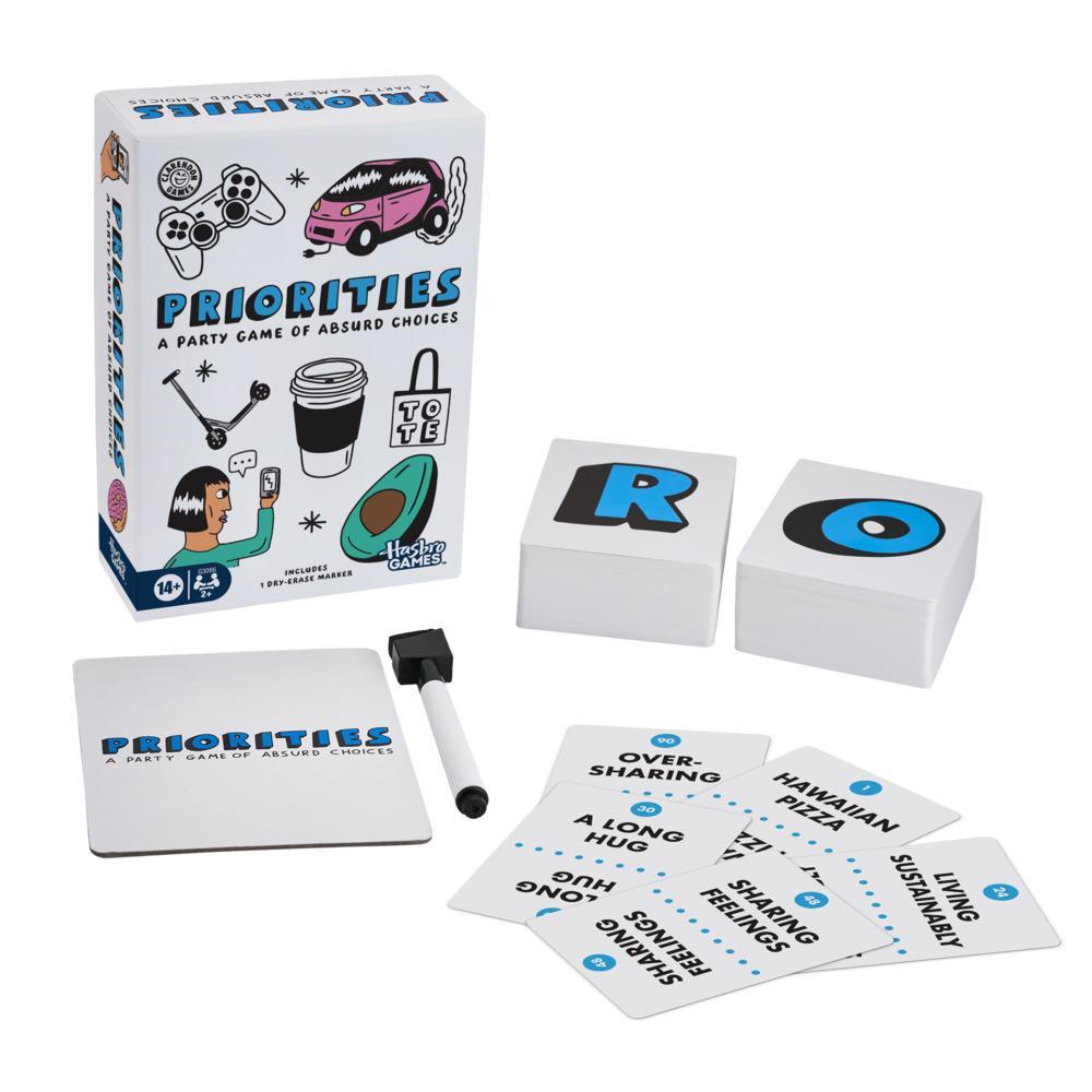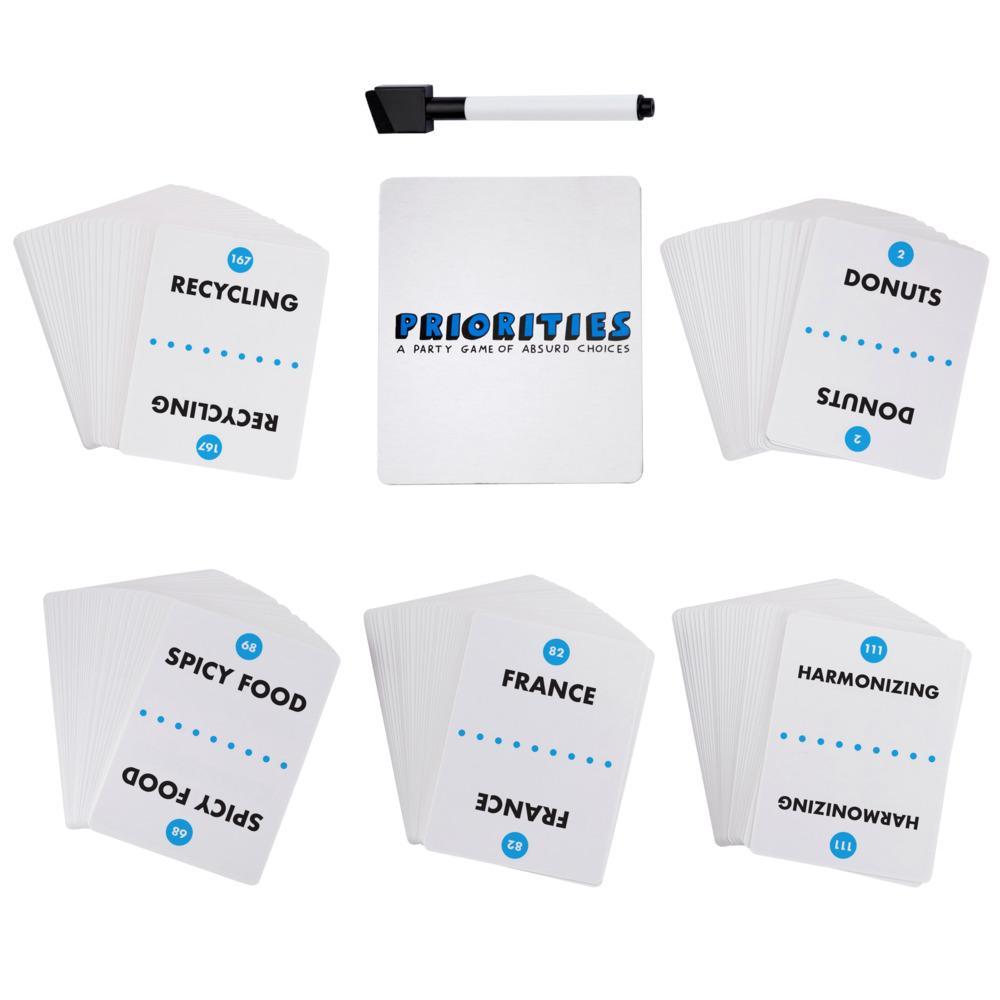The Priorities game is the party game of absurd choices. To play, draw 5 everyday item cards and rank them from love to loathe. The other players work as a group to try to guess your order. Then compare your answers. It’s everyone versus the game! You all earn a card for every item in the same rank, and the game earns the rest. To win, spell PRIORITIES using the letters on the backs of your earned cards before the game does. For 2 or more players, this unpredictable, fun party game for adults and teens takes only 2 minutes to learn and about 30 minutes to play. So, if you’re looking to add hilarity to Family Game Night and gatherings with friends, rank the Priorities game at the top of your list! Its compact size makes it a great portable game for vacations, camping, and nights out. Game night games for groups are cool gifts for teens ages 14+ and adults too. and all related trademarks and logos are trademarks of , Inc.