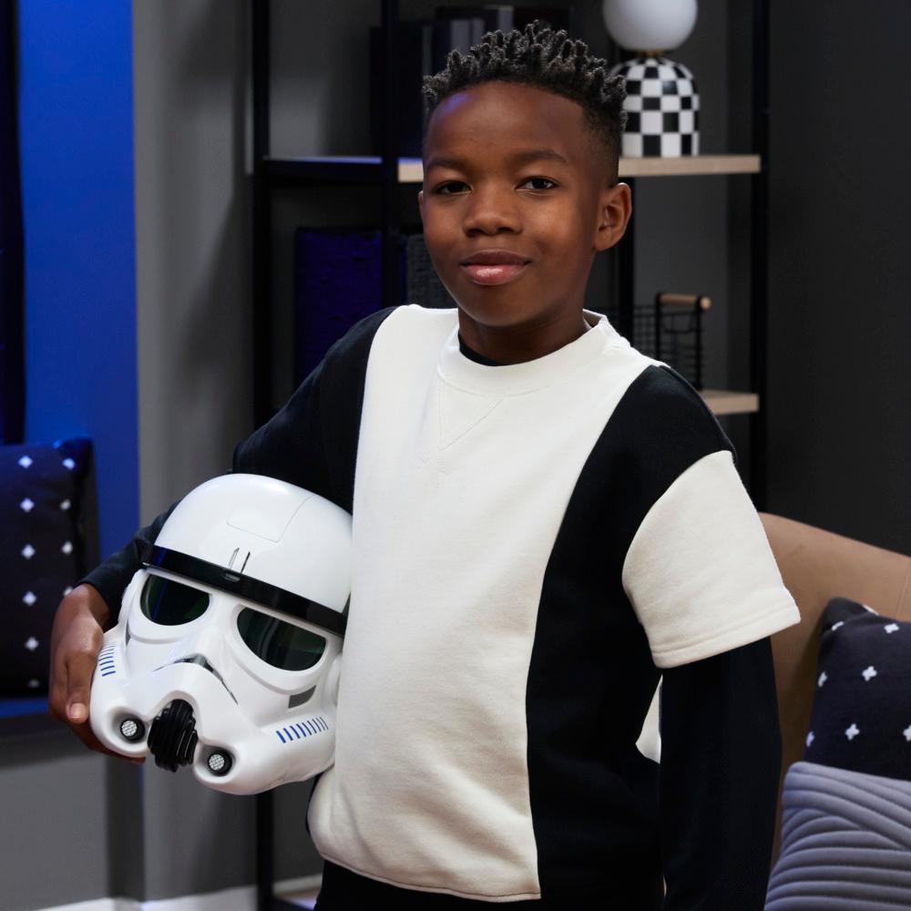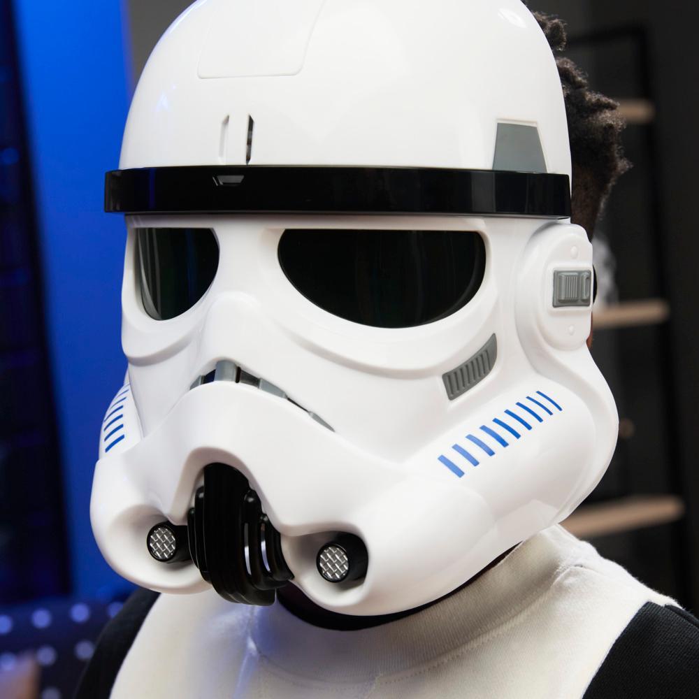 Channel a classic character and imagine adventures of the dark side with the Star Wars Stormtrooper Electronic Mask™. This Star Wars electronic mask features galactic sound effects and iconic stormtrooper phrases — simply press the button on the side of the mask to activate. This Star Wars toy features design and detail inspired by the helmets worn by stormtroopers and fits most kids’ heads with an adjustable strap. Kids masks make great Star Wars gifts for boys and girls, plus they’re the perfect addition to Star Wars costumes. Star Wars products are produced by under license from Lucasfilm Ltd.HASBRO and all related trademarks and logos are trademarks of , Inc.