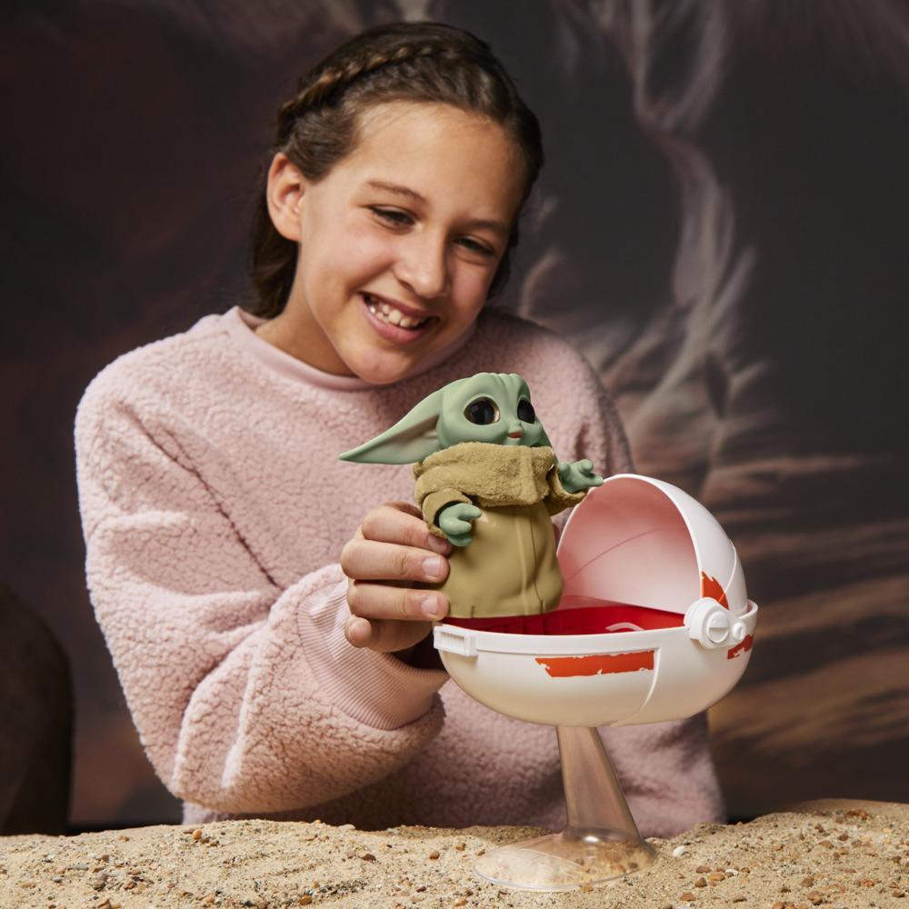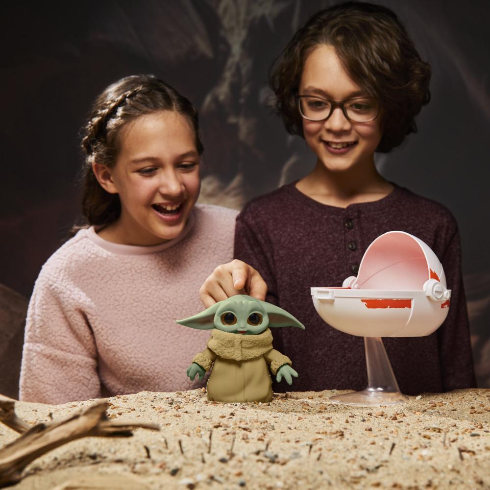 Bring home the most sought-after bounty in the galaxy with the Star Wars Wild Ridin’ Grogu interactive figure and hover pram. This Star Wars toy features design and deco inspired by The Mandalorian live-action series on Disney+. Kids ages 4 and up can imagine taking Grogu (The Child), affectionately referred to by fans as “Baby Yoda,” on galactic adventures or recreate their favorite Star Wars moments. Tap Grogu’s head, flip him upside down, lay him on his back, or place him in his hover pram to unlock more than 25 sound and movement combinations. Listen to Grogu giggle, watch him move his head, and activate fun flying sounds when Grogu moves with his hover pram. This animatronic toy includes a premium soft goods collar, soft-touch head and ears, pram, canopy, and hover pram stand. Star Wars products are produced by under license from Lucasfilm Ltd. and all related terms are trademarks of .
